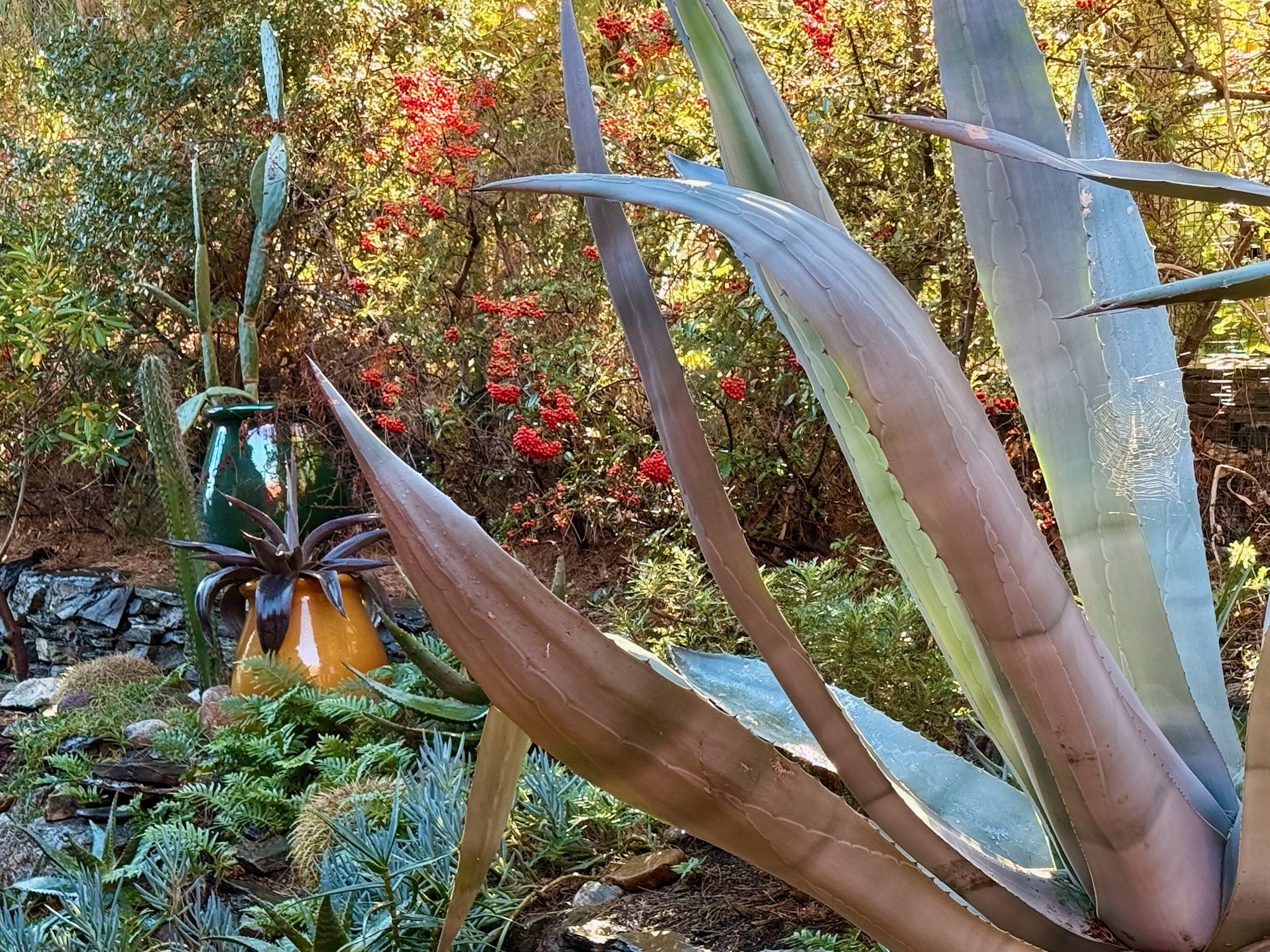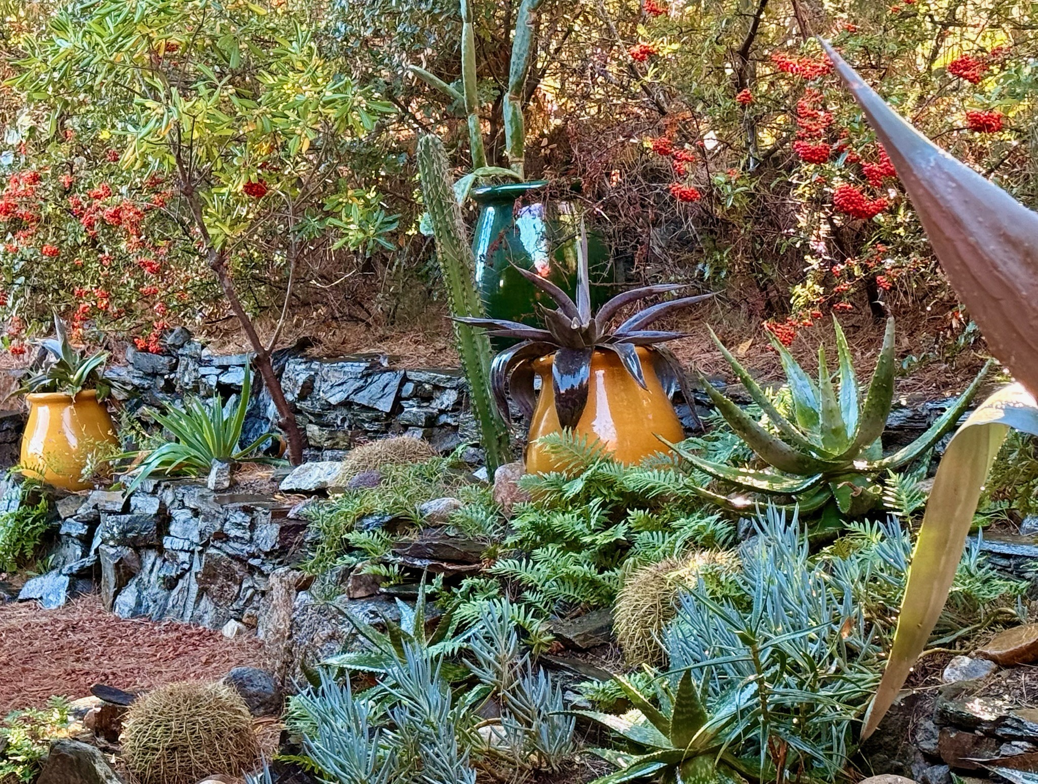Une association audacieuse où deux familles de végétaux que nous aimons tant se rencontrent au milieu du schiste et des poteries émaillées.